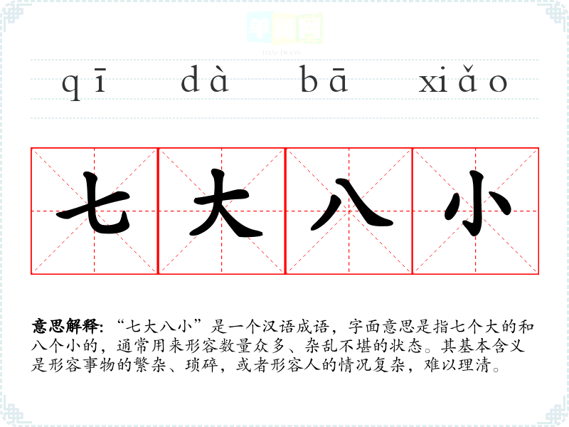 “七大八小”是一个汉语成语,字面意思是指七个大的和八个小的,通常用来形容数量众多、杂乱不堪的状态。其基本含义是形容事物的繁杂、琐碎,或者形容人的情况复杂,难以理清。