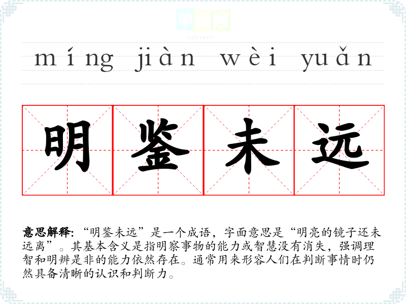 “明鉴未远”是一个成语,字面意思是“明亮的镜子还未远离”。其基本含义是指明察事物的能力或智慧没有消失,强调理智和明辨是非的能力依然存在。通常用来形容人们在判断事情时仍然具备清晰的认识和判断力。