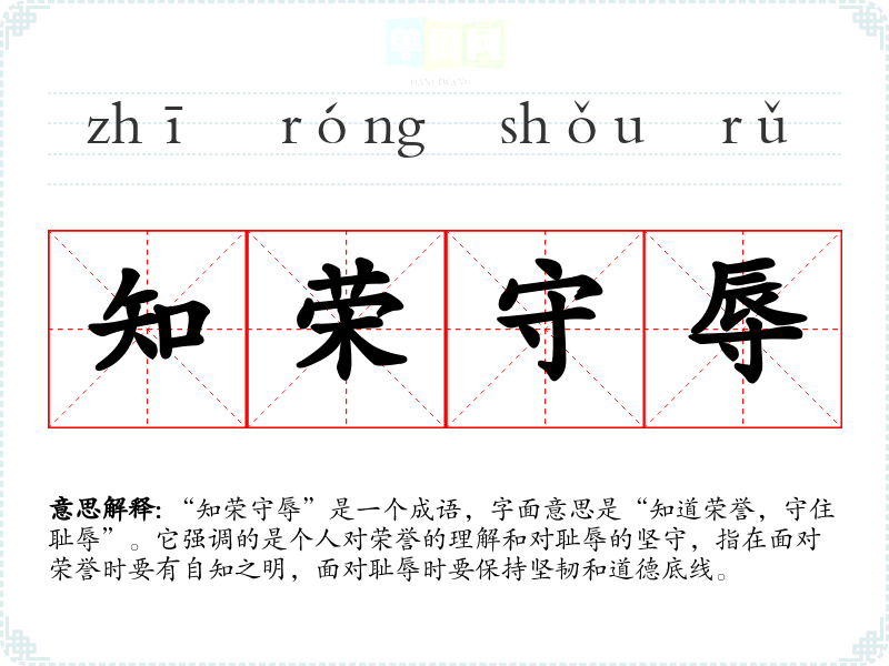 “知荣守辱”是一个成语,字面意思是“知道荣誉,守住耻辱”。它强调的是个人对荣誉的理解和对耻辱的坚守,指在面对荣誉时要有自知之明,面对耻辱时要保持坚韧和道德底线。