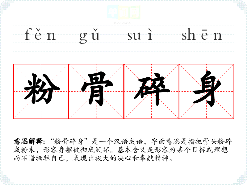 “粉骨碎身”是一个汉语成语,字面意思是指把骨头粉碎成粉末,形容身躯被彻底毁坏。基本含义是形容为某个目标或理想而不惜牺牲自己,表现出极大的决心和奉献精神。