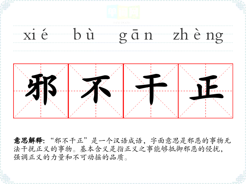 “邪不干正”是一个汉语成语,字面意思是邪恶的事物无法干扰正义的事物。基本含义是指正义之事能够抵御邪恶的侵扰,强调正义的力量和不可动摇的品质。