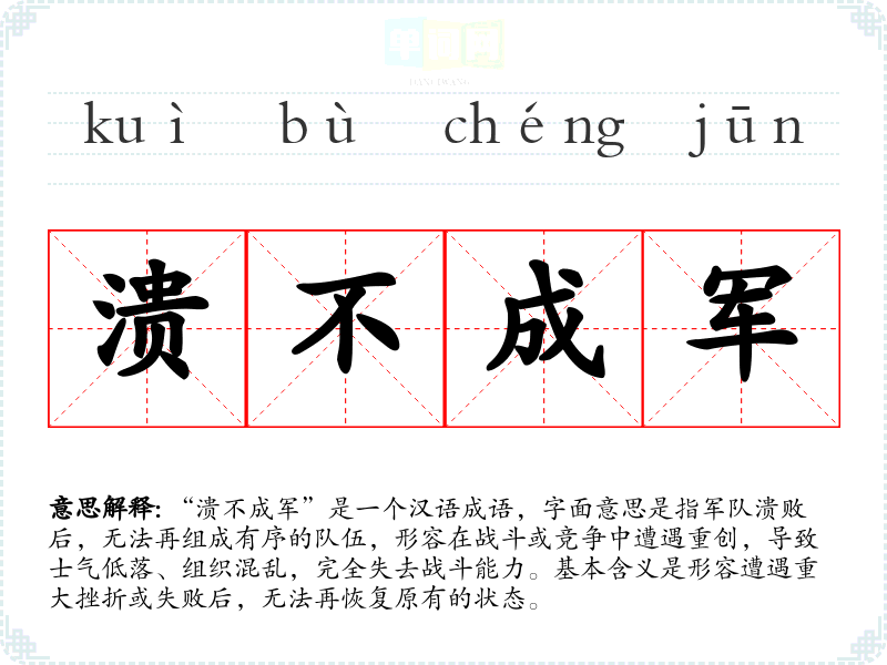 “溃不成军”是一个汉语成语,字面意思是指军队溃败后,无法再组成有序的队伍,形容在战斗或竞争中遭遇重创,导致士气低落、组织混乱,完全失去战斗能力。基本含义是形容遭遇重大挫折或失败后,无法再恢复原有的状态。