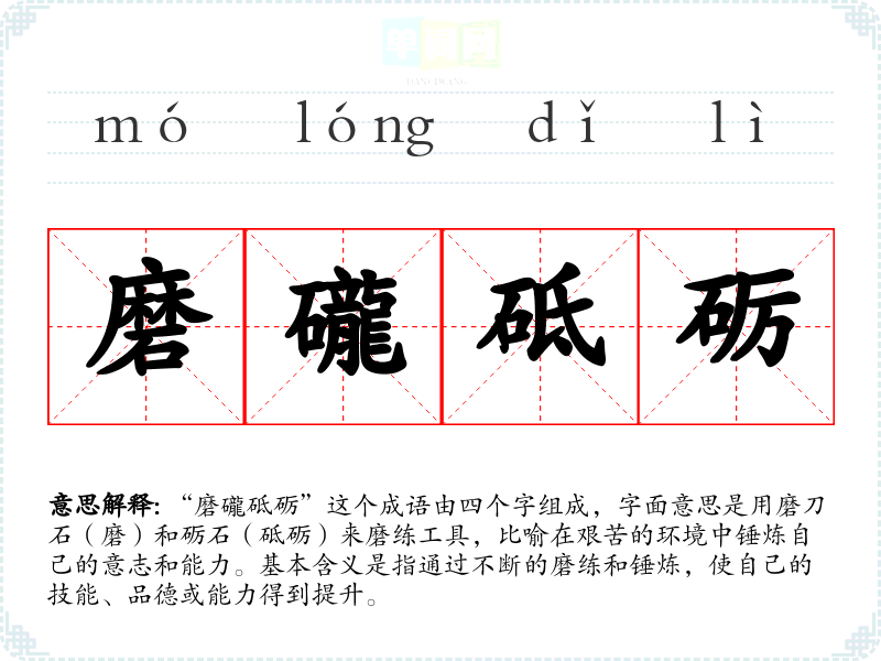 “磨礲砥砺”这个成语由四个字组成,字面意思是用磨刀石(磨)和砺石(砥砺)来磨练工具,比喻在艰苦的环境中锤炼自己的意志和能力。基本含义是指通过不断的磨练和锤炼,使自己的技能、品德或能力得到提升。