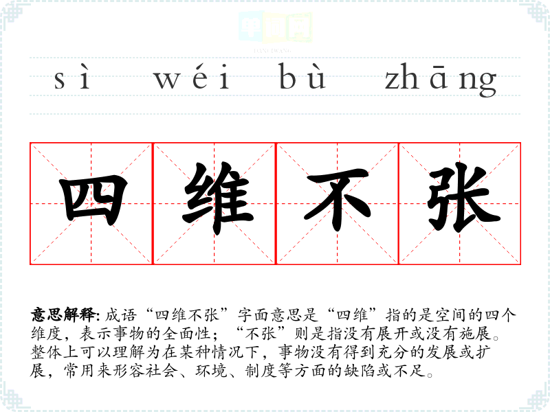 成语“四维不张”字面意思是“四维”指的是空间的四个维度,表示事物的全面性;“不张”则是指没有展开或没有施展。整体上可以理解为在某种情况下,事物没有得到充分的发展或扩展,常用来形容社会、环境、制度等方面的缺陷或不足。
