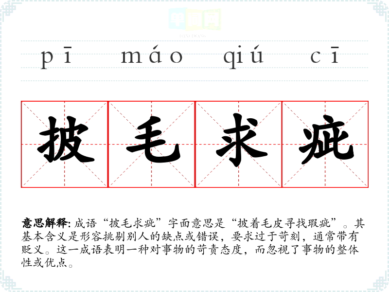 成语“披毛求疵”字面意思是“披着毛皮寻找瑕疵”。其基本含义是形容挑剔别人的缺点或错误,要求过于苛刻,通常带有贬义。这一成语表明一种对事物的苛责态度,而忽视了事物的整体性或优点。