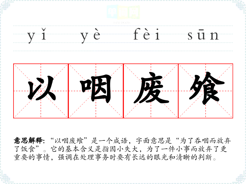 “以咽废飧”是一个成语,字面意思是“为了吞咽而放弃了饭食”。它的基本含义是指因小失大,为了一件小事而放弃了更重要的事情,强调在处理事务时要有长远的眼光和清晰的判断。