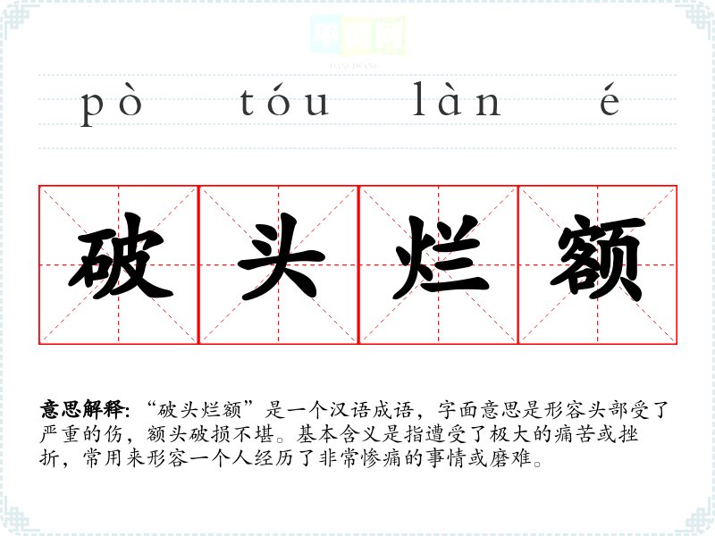 “破头烂额”是一个汉语成语,字面意思是形容头部受了严重的伤,额头破损不堪。基本含义是指遭受了极大的痛苦或挫折,常用来形容一个人经历了非常惨痛的事情或磨难。
