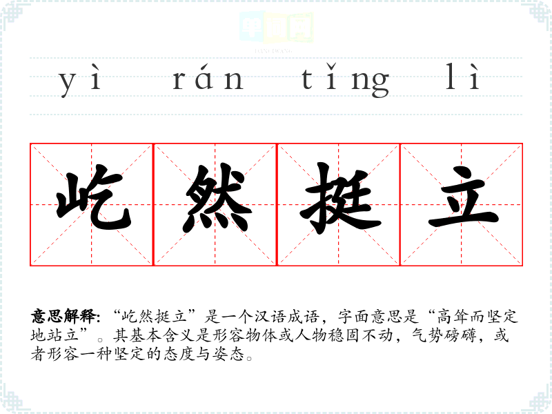 | 屹然挺立 | 屹然:高耸的样子。像山峰一样高耸而坚定地直立着 |