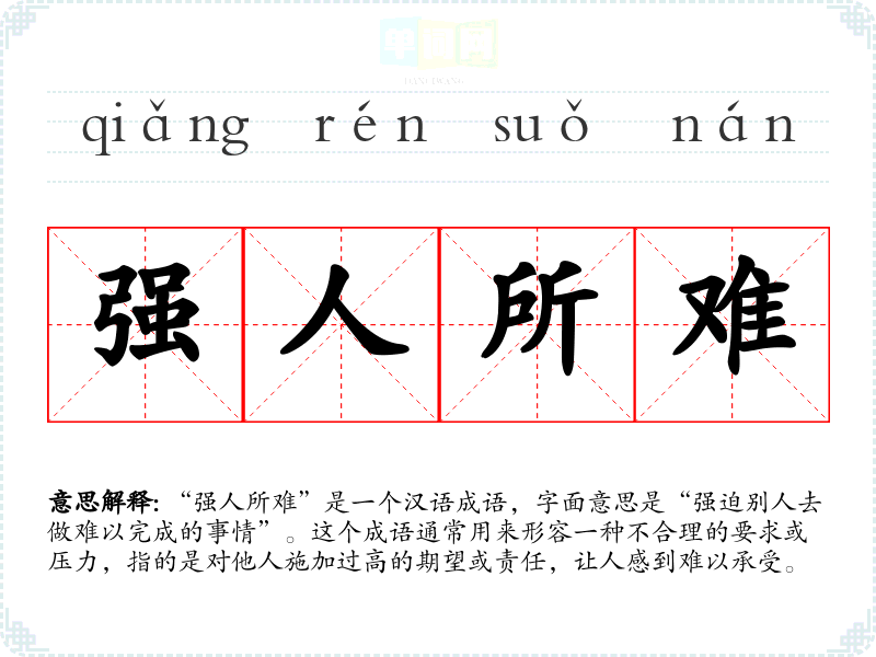 “强人所难”是一个汉语成语,字面意思是“强迫别人去做难以完成的事情”。这个成语通常用来形容一种不合理的要求或压力,指的是对他人施加过高的期望或责任,让人感到难以承受。
