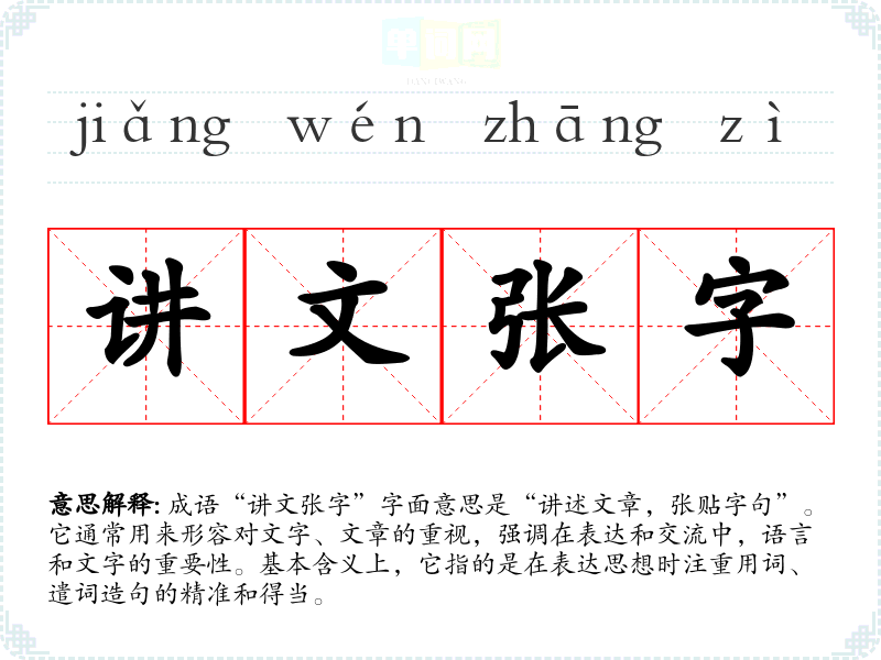 成语“讲文张字”字面意思是“讲述文章,张贴字句”。它通常用来形容对文字、文章的重视,强调在表达和交流中,语言和文字的重要性。基本含义上,它指的是在表达思想时注重用词、遣词造句的精准和得当。