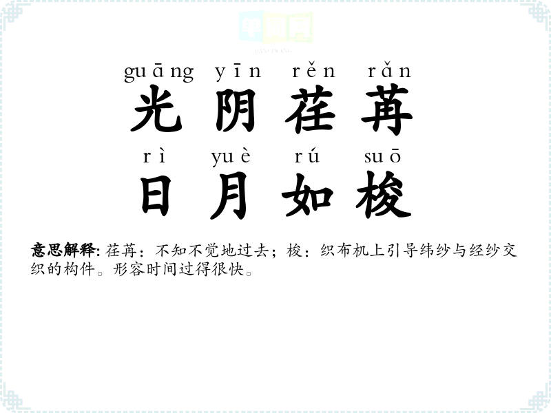 | 光阴荏苒,日月如梭 | 荏苒:不知不觉地过去;梭:织布机上引导纬纱与经纱交织的构件。形容时间过得很快。 |