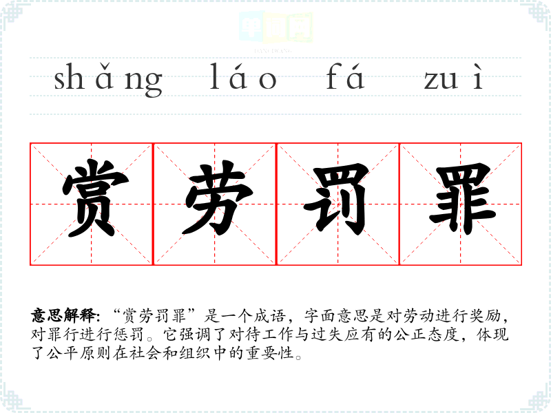 “赏劳罚罪”是一个成语,字面意思是对劳动进行奖励,对罪行进行惩罚。它强调了对待工作与过失应有的公正态度,体现了公平原则在社会和组织中的重要性。