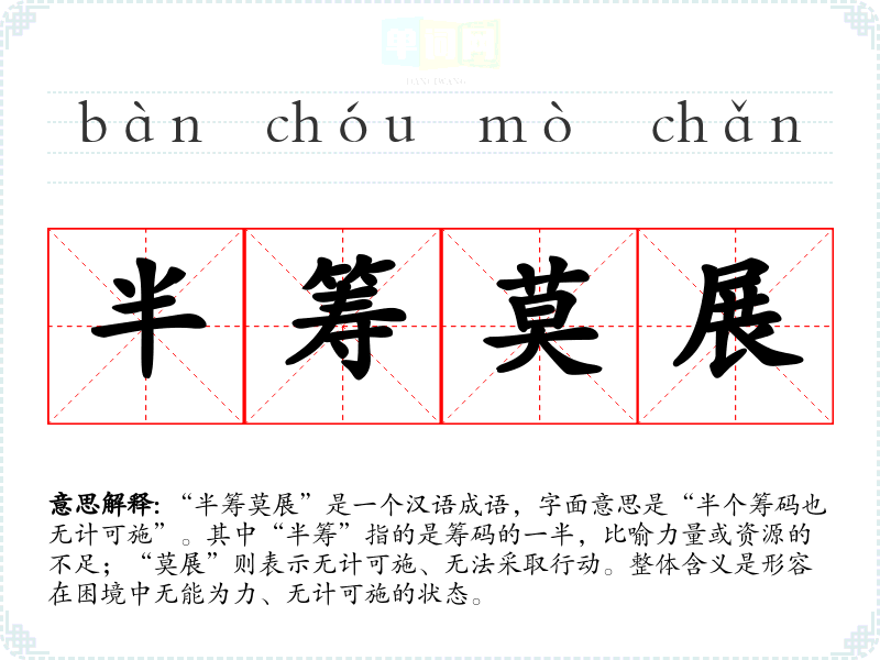 半筹莫展 半条计策也拿不出来。比喻一点办法也没有。
