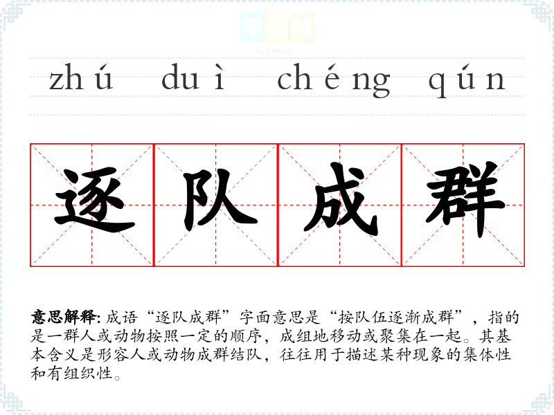 成语“逐队成群”字面意思是“按队伍逐渐成群”,指的是一群人或动物按照一定的顺序,成组地移动或聚集在一起。其基本含义是形容人或动物成群结队,往往用于描述某种现象的集体性和有组织性。