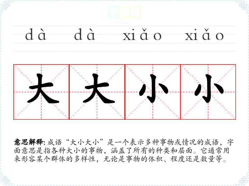 成语“大小大小”是一个表示多种事物或情况的成语,字面意思是指各种大小的事物,涵盖了所有的种类和层面。它通常用来形容某个群体的多样性,无论是事物的体积、程度还是数量等。