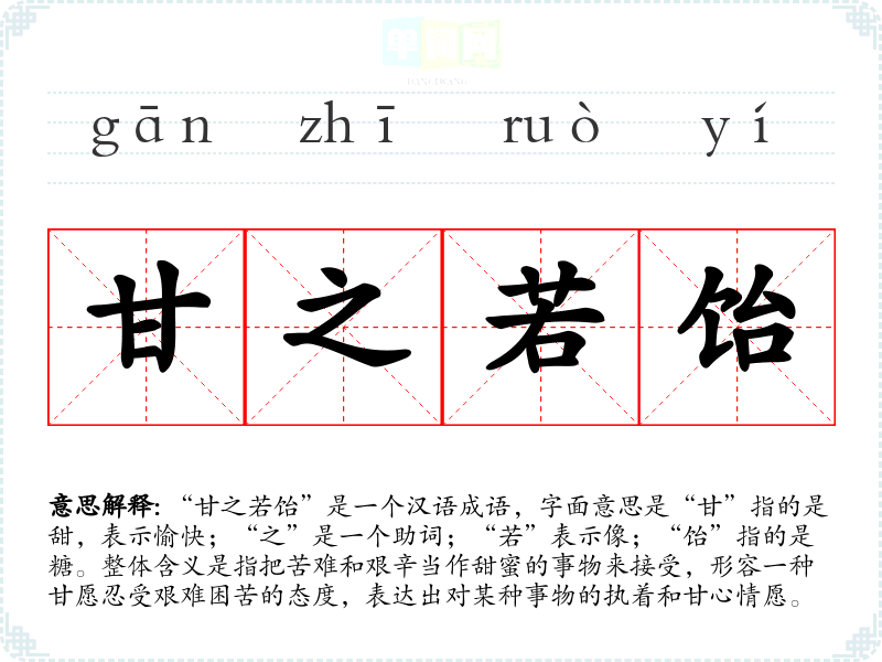 | 甘之若饴 | 甘:以为甘;饴:甜。把它看成像糖那样甜。比喻甘愿承担艰苦的事情和作出牺牲。 |