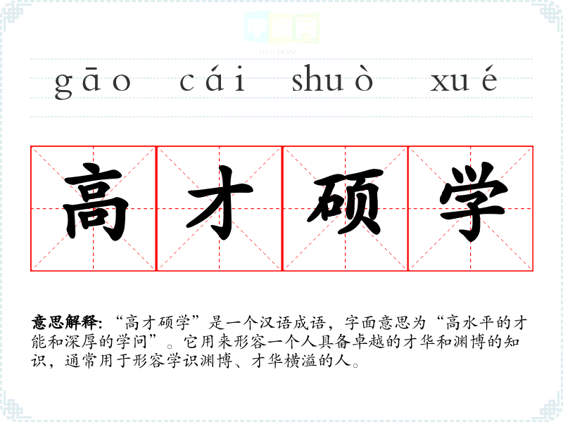 “高才硕学”是一个汉语成语,字面意思为“高水平的才能和深厚的学问”。它用来形容一个人具备卓越的才华和渊博的知识,通常用于形容学识渊博、才华横溢的人。