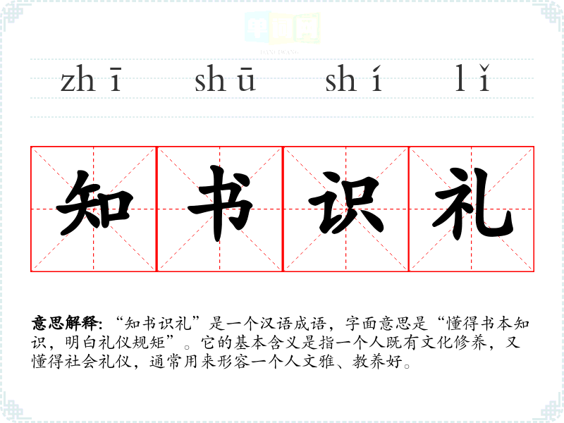 “知书识礼”是一个汉语成语,字面意思是“懂得书本知识,明白礼仪规矩”。它的基本含义是指一个人既有文化修养,又懂得社会礼仪,通常用来形容一个人文雅、教养好。