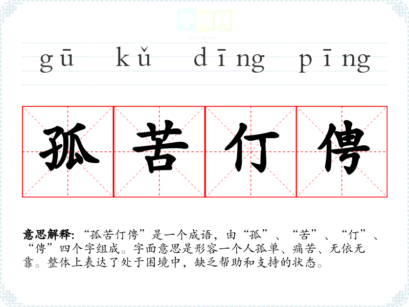| 伶仃孤苦 | 伶仃:孤独,没有依靠。孤单困苦,没有依靠。 |