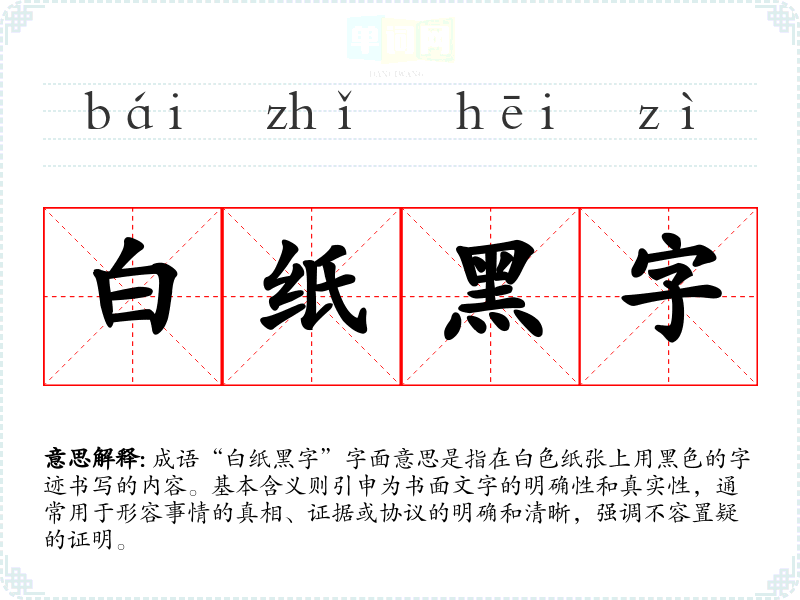 成语“白纸黑字”字面意思是指在白色纸张上用黑色的字迹书写的内容。基本含义则引申为书面文字的明确性和真实性,通常用于形容事情的真相、证据或协议的明确和清晰,强调不容置疑的证明。