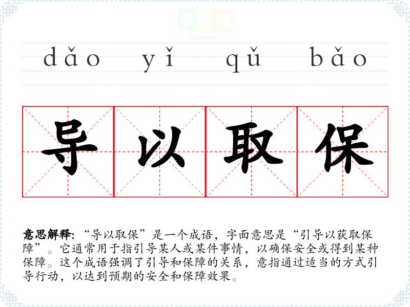 “导以取保”是一个成语,字面意思是“引导以获取保障”。它通常用于指引导某人或某件事情,以确保安全或得到某种保障。这个成语强调了引导和保障的关系,意指通过适当的方式引导行动,以达到预期的安全和保障效果。