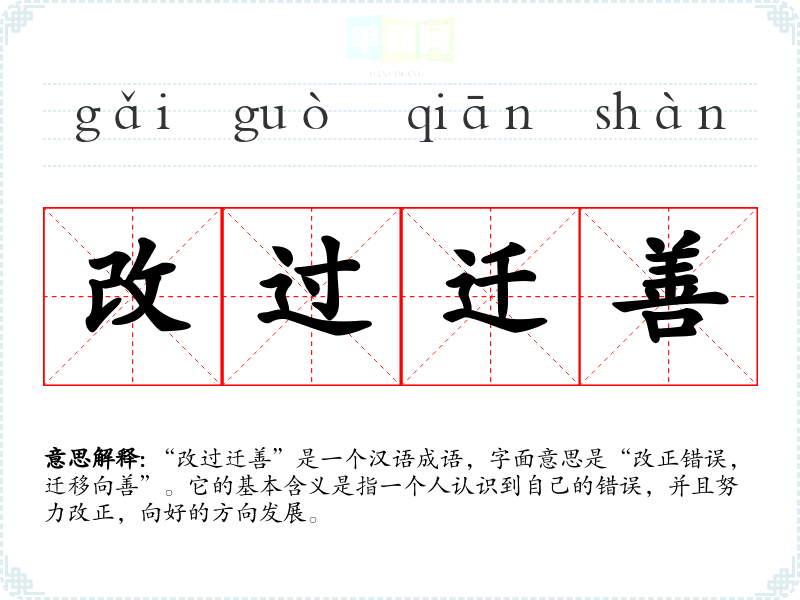 “改过迁善”是一个汉语成语,字面意思是“改正错误,迁移向善”。它的基本含义是指一个人认识到自己的错误,并且努力改正,向好的方向发展。