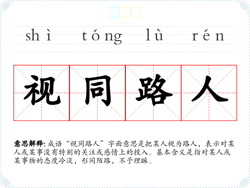 成语“视同路人”字面意思是把某人视为路人,表示对某人或某事没有特别的关注或感情上的投入。基本含义是指对某人或某事物的态度冷淡,形同陌路,不予理睬。