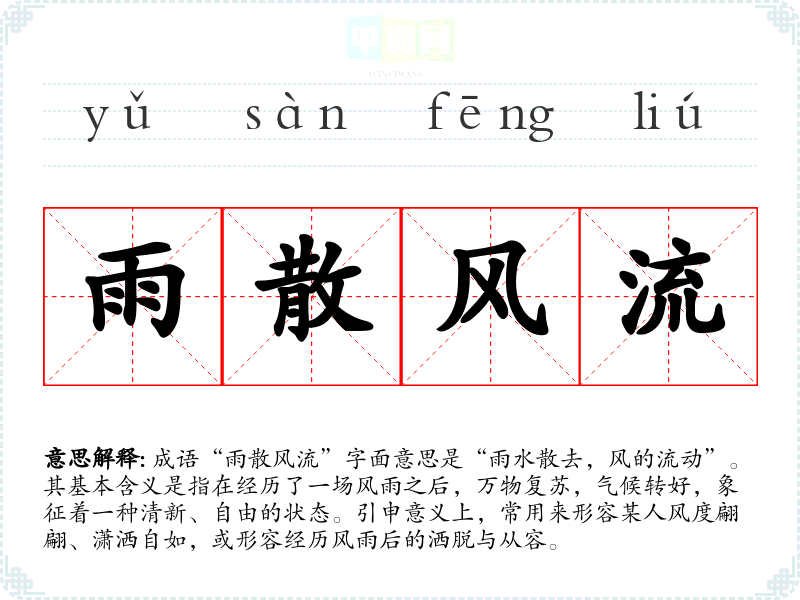 成语“雨散风流”字面意思是“雨水散去,风的流动”。其基本含义是指在经历了一场风雨之后,万物复苏,气候转好,象征着一种清新、自由的状态。引申意义上,常用来形容某人风度翩翩、潇洒自如,或形容经历风雨后的洒脱与从容。