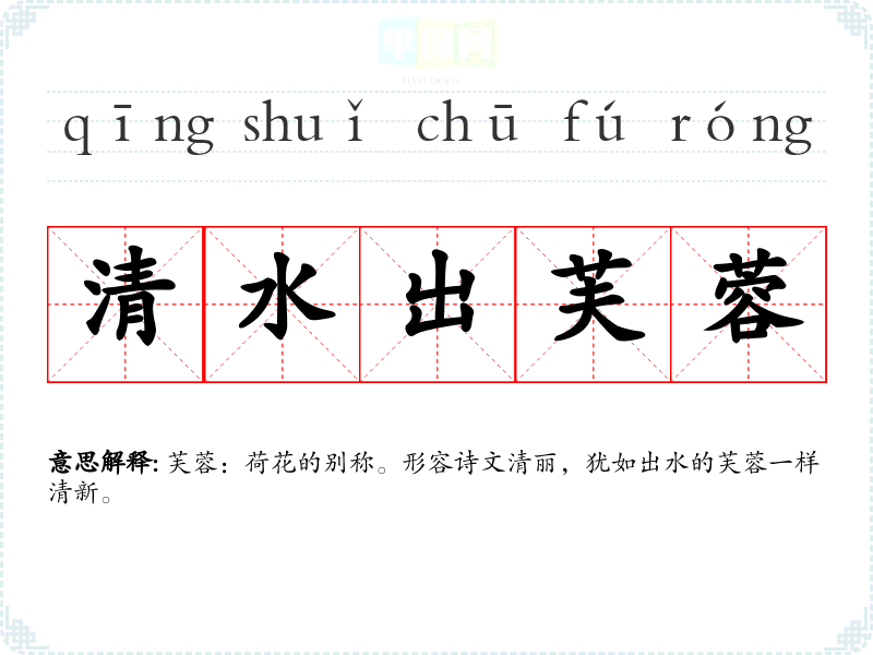 | 清水出芙蓉 | 芙蓉:荷花的别称。形容诗文清丽,犹如出水的芙蓉一样清新。 |