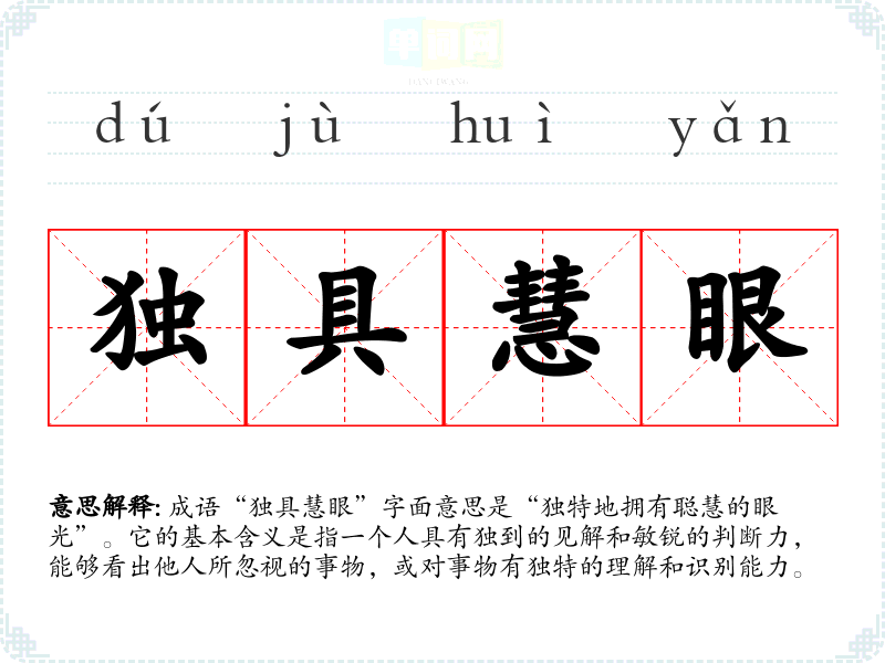 成语“独具慧眼”字面意思是“独特地拥有聪慧的眼光”。它的基本含义是指一个人具有独到的见解和敏锐的判断力,能够看出他人所忽视的事物,或对事物有独特的理解和识别能力。