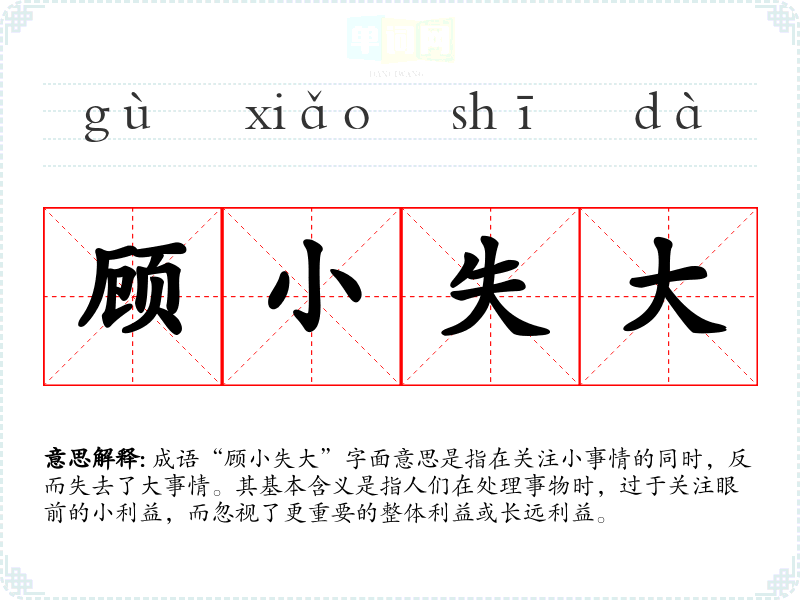 成语“顾小失大”字面意思是指在关注小事情的同时,反而失去了大事情。其基本含义是指人们在处理事物时,过于关注眼前的小利益,而忽视了更重要的整体利益或长远利益。