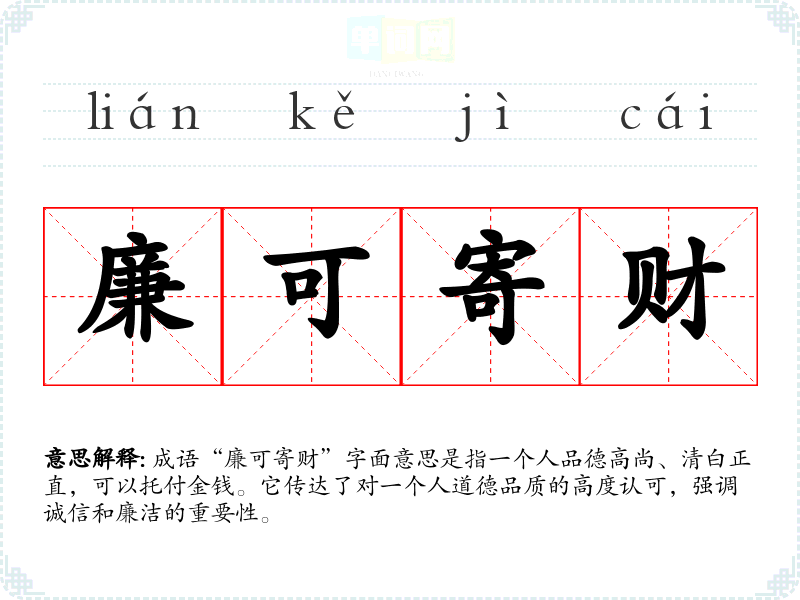 成语“廉可寄财”字面意思是指一个人品德高尚、清白正直,可以托付金钱。它传达了对一个人道德品质的高度认可,强调诚信和廉洁的重要性。