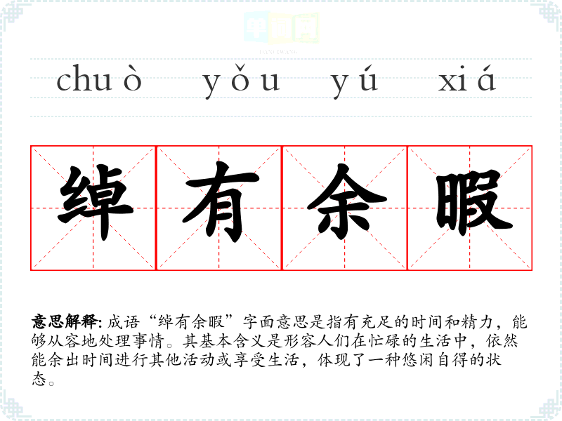 成语“绰有余暇”字面意思是指有充足的时间和精力,能够从容地处理事情。其基本含义是形容人们在忙碌的生活中,依然能余出时间进行其他活动或享受生活,体现了一种悠闲自得的状态。