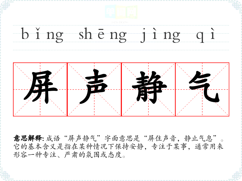 成语“屏声静气”字面意思是“屏住声音,静止气息”。它的基本含义是指在某种情况下保持安静,专注于某事,通常用来形容一种专注、严肃的氛围或态度。