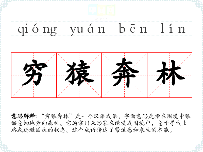 “穷猿奔林”是一个汉语成语,字面意思是指在困境中猿猴急切地奔向森林。它通常用来形容在绝境或困境中,急于寻找出路或逃避困扰的状态。这个成语传达了紧迫感和求生的本能。