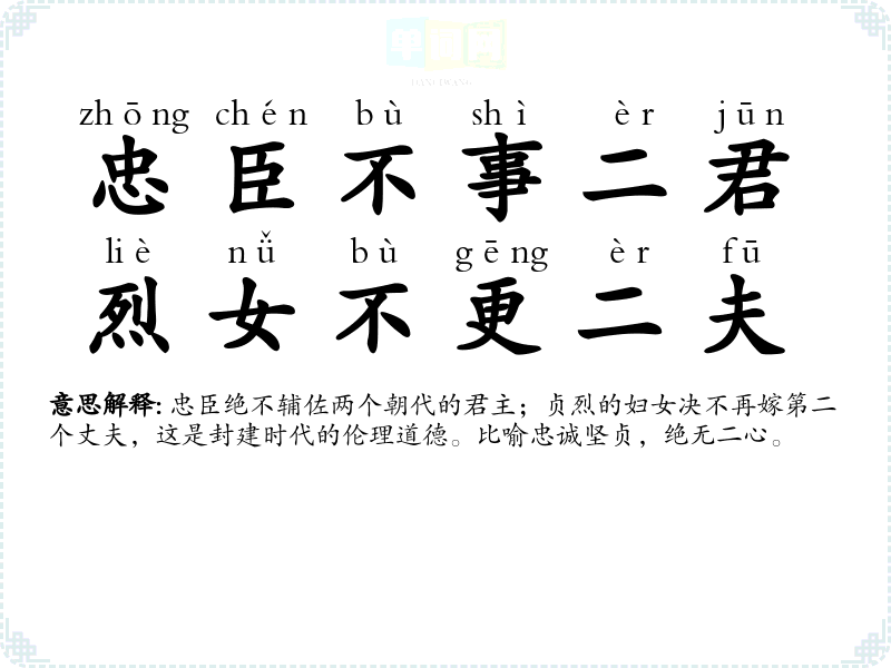 | 九烈三贞 | 贞:贞操;烈:节烈。封建社会用来赞誉妇女的贞烈。 |