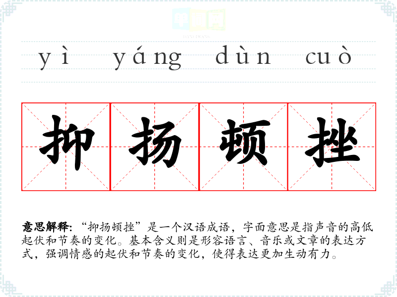 | 抑扬顿挫 | 抑:降低;扬:升高;顿:停顿;挫:转折。指声音的高低起伏和停顿转折。 |
