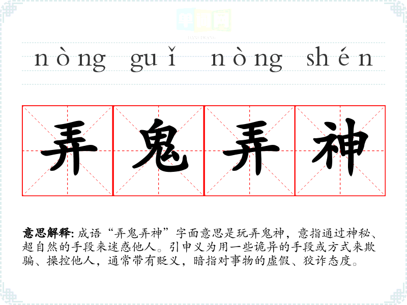 成语“弄鬼弄神”字面意思是玩弄鬼神,意指通过神秘、超自然的手段来迷惑他人。引申义为用一些诡异的手段或方式来欺骗、操控他人,通常带有贬义,暗指对事物的虚假、狡诈态度。