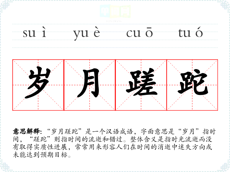 “岁月蹉跎”是一个汉语成语,字面意思是“岁月”指时间,“蹉跎”则指时间的流逝和错过。整体含义是指时光流逝而没有取得实质性进展,常常用来形容人们在时间的消逝中迷失方向或未能达到预期目标。