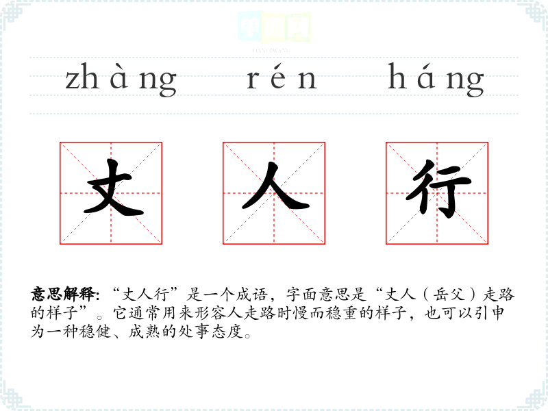 “丈人行”是一个成语,字面意思是“丈人(岳父)走路的样子”。它通常用来形容人走路时慢而稳重的样子,也可以引申为一种稳健、成熟的处事态度。