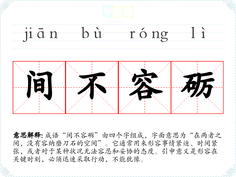 成语“间不容砺”由四个字组成,字面意思为“在两者之间,没有容纳磨刀石的空间”。它通常用来形容事情紧迫、时间紧张,或者对于某种状况无法容忍和妥协的态度。引申意义是形容在关键时刻,必须迅速采取行动,不能犹豫。