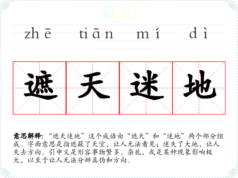 “遮天迷地”这个成语由“遮天”和“迷地”两个部分组成。字面意思是指遮蔽了天空,让人无法看见;迷失了大地,让人失去方向。引申义是形容事物繁多、杂乱,或是某种现象影响极大,以至于让人无法分辨真伪和方向。