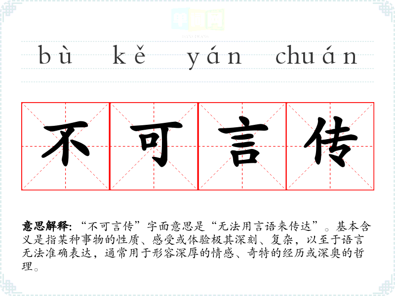 “不可言传”字面意思是“无法用言语来传达”。基本含义是指某种事物的性质、感受或体验极其深刻、复杂,以至于语言无法准确表达,通常用于形容深厚的情感、奇特的经历或深奥的哲理。