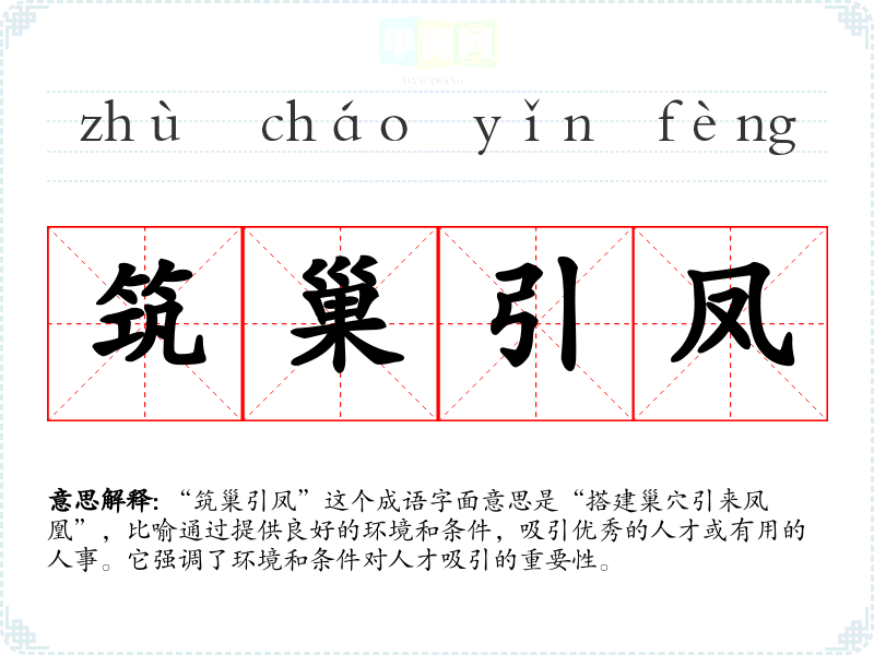 “筑巢引凤”这个成语字面意思是“搭建巢穴引来凤凰”,比喻通过提供良好的环境和条件,吸引优秀的人才或有用的人事。它强调了环境和条件对人才吸引的重要性。