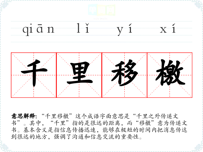 “千里移檄”这个成语字面意思是“千里之外传递文书”。其中,“千里”指的是很远的距离,而“移檄”意为传递文书。基本含义是指信息传播迅速,能够在极短的时间内把消息传达到很远的地方,强调了沟通和信息交流的重要性。