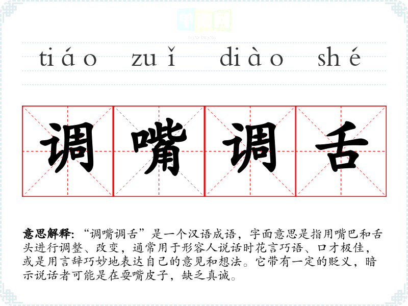“调嘴调舌”是一个汉语成语,字面意思是指用嘴巴和舌头进行调整、改变,通常用于形容人说话时花言巧语、口才极佳,或是用言辞巧妙地表达自己的意见和想法。它带有一定的贬义,暗示说话者可能是在耍嘴皮子,缺乏真诚。