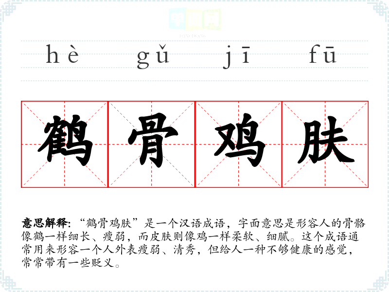 “鹤骨鸡肤”是一个汉语成语,字面意思是形容人的骨骼像鹤一样细长、瘦弱,而皮肤则像鸡一样柔软、细腻。这个成语通常用来形容一个人外表瘦弱、清秀,但给人一种不够健康的感觉,常常带有一些贬义。