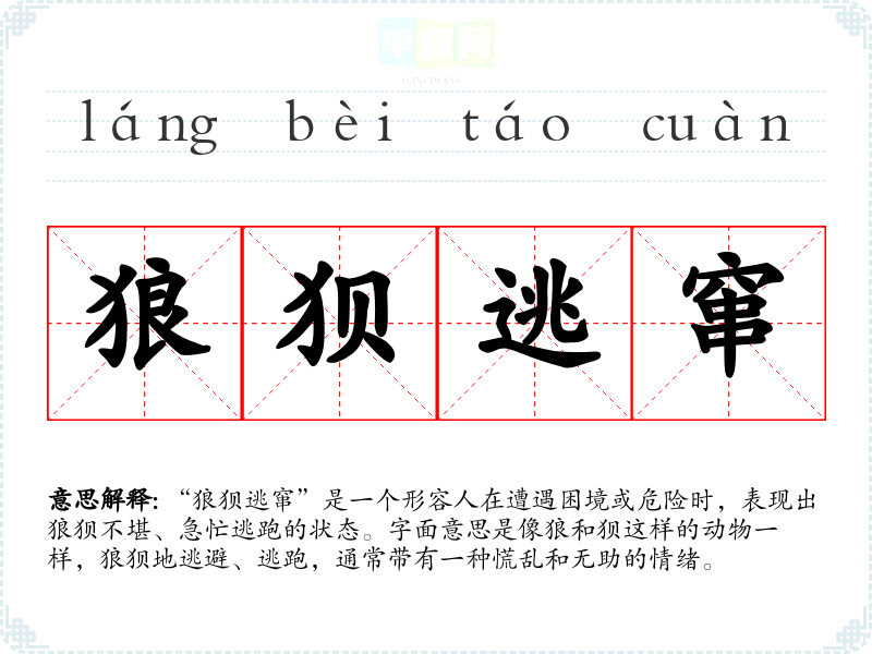 这个成语的来源并没有明确的历史典故,但“狼狈”二字本身在古代文献中就有提及,意指形态不堪、窘迫的样子。“逃窜”则是指快速逃跑。从字面来看,成语组合了二者的意义,强调了在危急情况下的狼狈和慌乱。