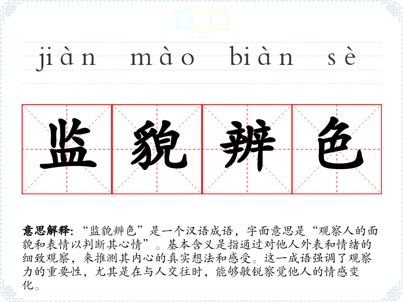 “监貌辨色”是一个汉语成语,字面意思是“观察人的面貌和表情以判断其心情”。基本含义是指通过对他人外表和情绪的细致观察,来推测其内心的真实想法和感受。这一成语强调了观察力的重要性,尤其是在与人交往时,能够敏锐察觉他人的情感变化。