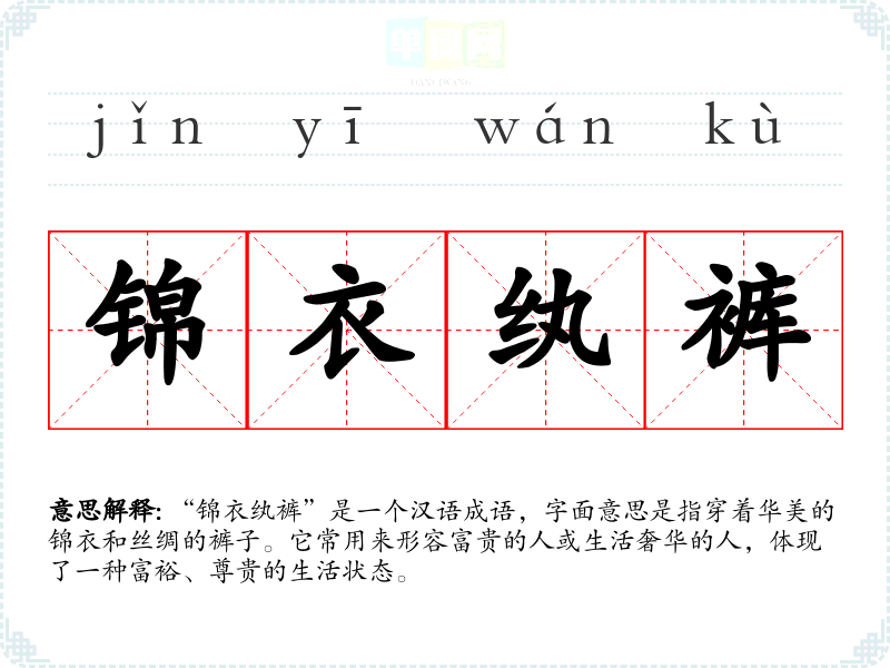 “锦衣纨裤”是一个汉语成语,字面意思是指穿着华美的锦衣和丝绸的裤子。它常用来形容富贵的人或生活奢华的人,体现了一种富裕、尊贵的生活状态。
